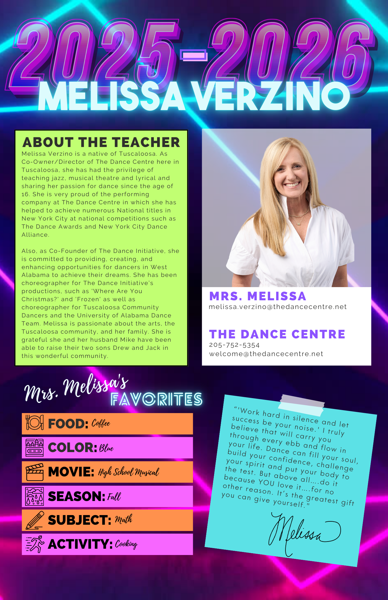 “'Work hard in silence and let success be your noise.' I truly believe that will carry you through every ebb and flow in your life. Dance can fill your soul, build your confidence, challenge your spirit and put your body to the test. But above all….do it because YOU love it….for no other reason. It’s the greatest gift you can give yourself."